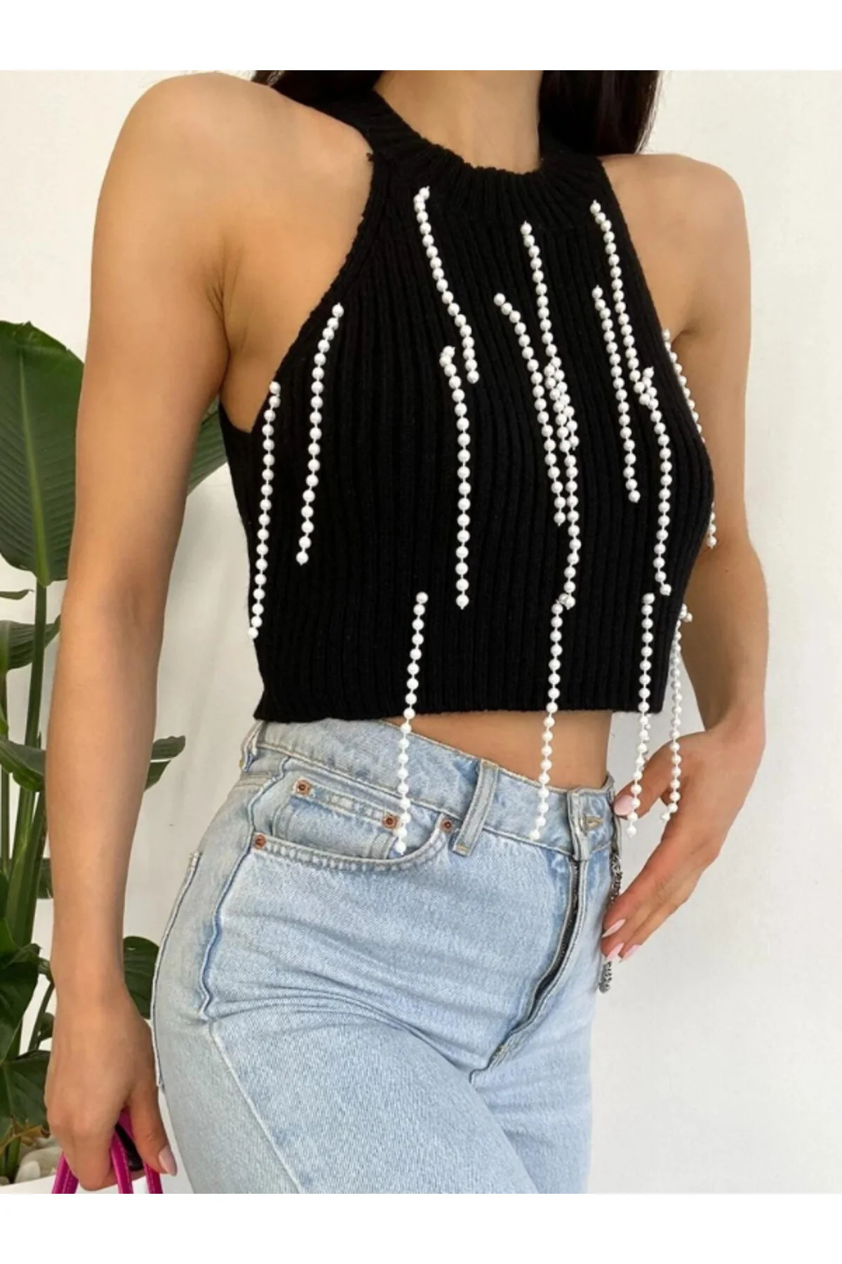 Kadın Siyah Halter Yaka Boncuklu Triko Crop Bluz